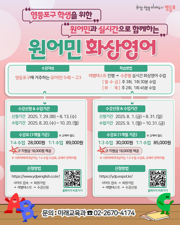 오는 31일까지 9~10월 과정 수강생 600여 명을 선착순 모집하며, 모든 수강생은 레벨 테스트를 거쳐 개별 수준에 맞는 학습 단계로 배정된다. 신청은 ‘영등포구 원어민 화상영어’ 누리집(홈페이지)에서 가능하다.