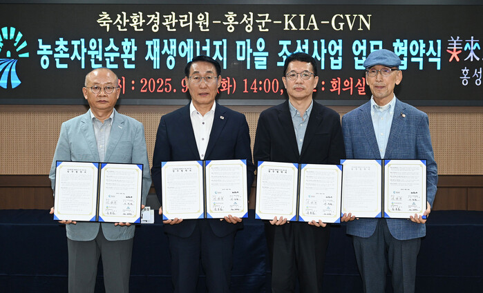 [홍성=최복규 기자] 충남 홍성군이 2일 홍성군청에서 기아, 축산환경관리원, 글로벌비젼네트워크와 함께 ‘농촌자원순환 재생에너지 마을 조성’ 사업 추진을 위한 업무협약(MOU)을 체결하고, 사업단을 공식 발족했다.