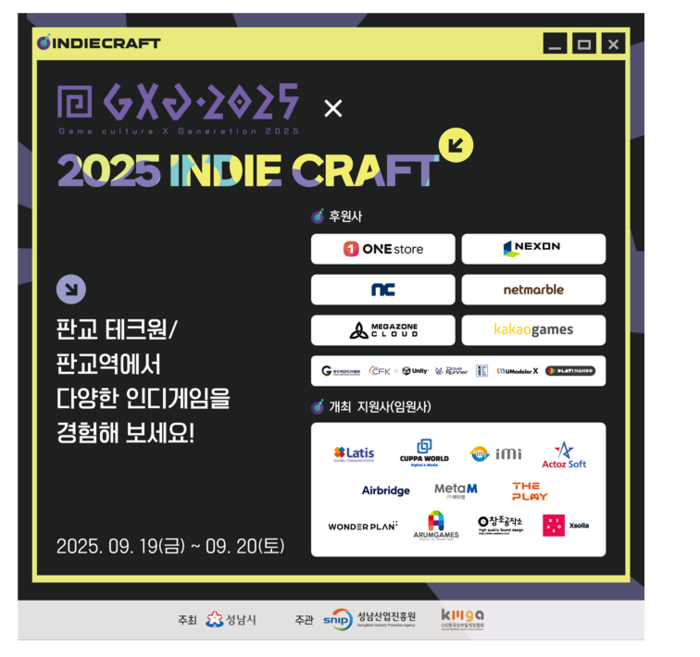 [성남=오왕석 기자] 대한민국 대표 인디게임 축제 ‘2025 인디크래프트’가 오는 9월 19일(금)부터 20일(토)까지 이틀간 성남게임문화축제 GXG와 함께 판교역 광장에서 열린다.
