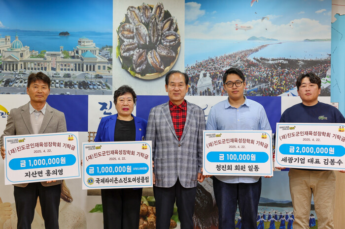 진도 3ㆍ4월의 나눔 전도사 ▲청진회(청년진도모임) 10만원 ▲고군면 허광무 100만원 ▲제일타카 대표 김희숙 500만원 ▲국제라이온스진도여성클럽 100만원을 기탁했으며, 이들은 “작은 나눔이지만 우리 지역 학생들이 꿈을 향해 무한히 나아가길 바라는 마음으로 기탁에 동참하게 됐다. 미래인재들의 꿈을 응원하는 나눔에 지속적으로 관심과 지원을 아끼지 않겠다”고 말했다.