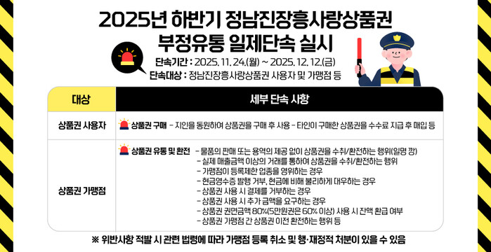 이번 단속은 지역사랑상품권의 부정유통을 사전에 차단하고 건전한 유통질서 확립을 위해 추진된다.