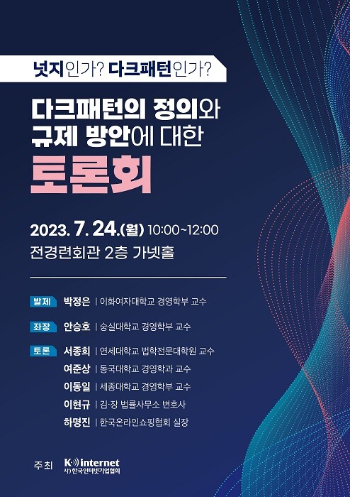 토론회는 이화여자대학교 경영학부 박정은 교수가 “넛지 마케팅과 다크패턴의 경계에서”라는 주제로 발제를 하며, 이어 숭실대학교 경영학부 안승호 교수를 좌장으로 연세대학교 법학전문대학원 서종희 교수, 세종대학교 경영학부 이동일 교수, 동국대학교 경영학과 여준상 교수, 김⸱장 법률사무소 이현규 변호사, 한국온라인쇼핑협회 하명진 실장이 토론에 참여한다.