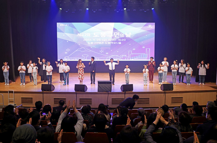 도봉구가 최근 제27회 도봉구민의 날 기념행사를 개최했다. 기념 행사에서는 도봉구민대상 시상(총 4명·1개 단체), 명예구청장 위촉(총 6명) 등이 진행됐다. 사진은 이날 도봉구민 大합창에서 이동진 구청장(가운데)이 지역 주민들과 함께하고 있는 모습. (사진제공=도봉구청)