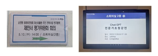 [순천=이문석 기자] 전남 순천시가 시청 대회의실과 소회의실에서 개최하는 각종 회의ㆍ행사ㆍ교육을 안내하는 게시판을 종이 출력물 게첨 대신 디지털 모니터로 표출하는 스마트 회의 안내시스템을 도입했다.