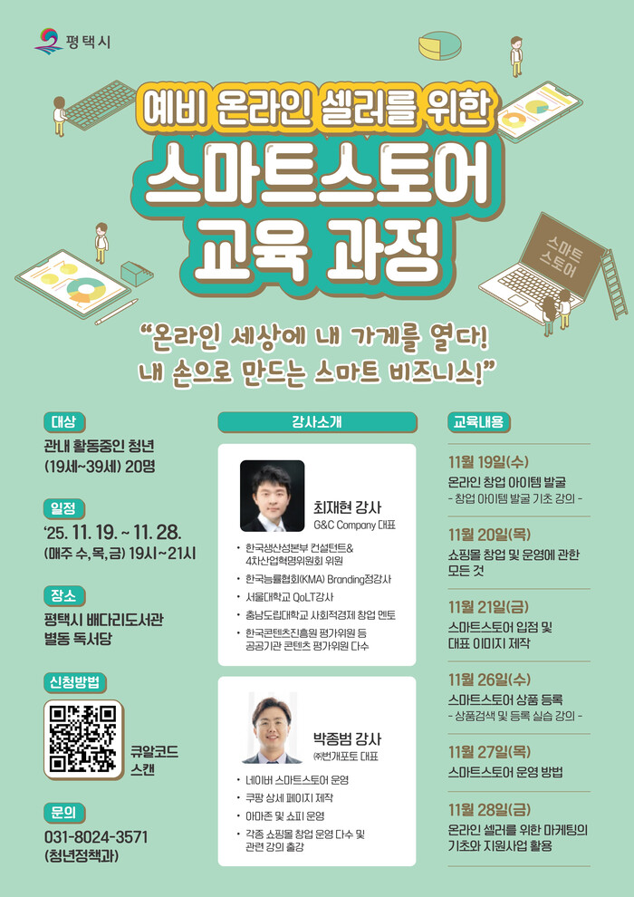 참가 대상은 평택시 관내에서 활발하게 활동 중인 만 19세부터 39세까지의 청년 사업가이며, 신청 기간은 10월 31일부터 11월 19일까지 안내 이미지의 정보무늬(QR코드)를 통해 접수할 수 있다. 이번 교육에 대한 자세한 문의는 평택시청 청년정책과로 하면 된다.