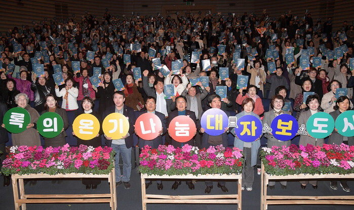 | ▲ 강기정 광주광역시장(사진 앞줄 가운데)이 11일 오후 시청 대회의실에서 열린 ‘2024 광주광역시 자원봉사자대회’에 참석해 참석자들과 함께 퍼포먼스를 하고 있다. /광주광역시 제공 |