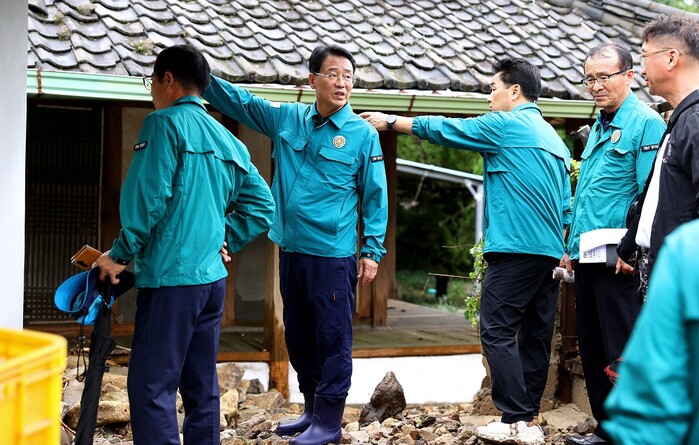 | ▲ 강진원 군수가 지난 22일, 군동 석동마을에 방문해, 빗물에 쓸려온 돌과 토사 등을 조속히 처리할 것을 지시하고 있다./ 강진군 제공 |
