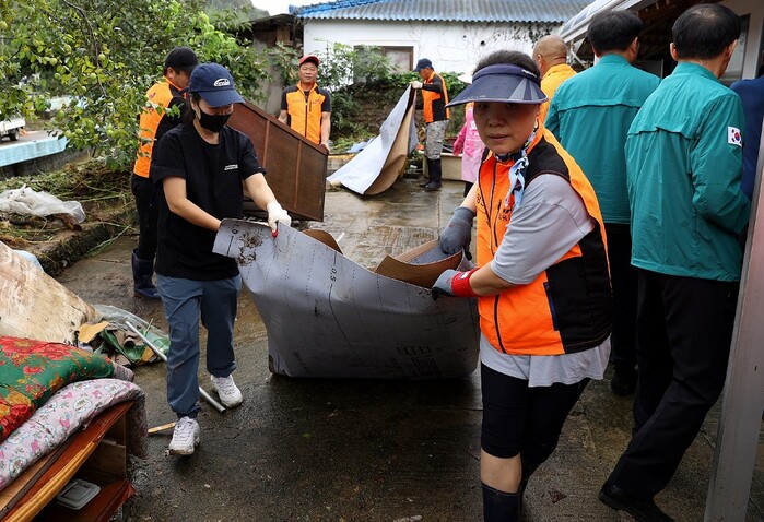 | ▲ 강진군자원봉사센터 소속 회원들이 지난 22일, 병영면 동삼인마을의 침수 가옥의 방안 장판을 옮기고 있다. / 강진군 제공 |