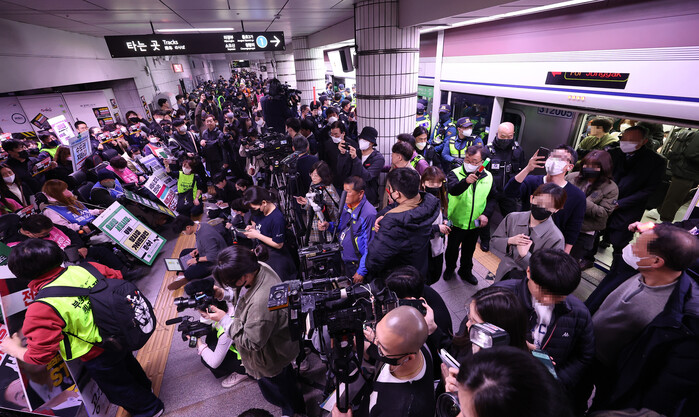 전장연 활동가 10명가량은 이날 오전 8시 지하철 1호선 시청역 상행선 10-4 승강장에서 기자회견을 한 뒤 오전 8시48분께부터 지하철 탑승을 시도했다.