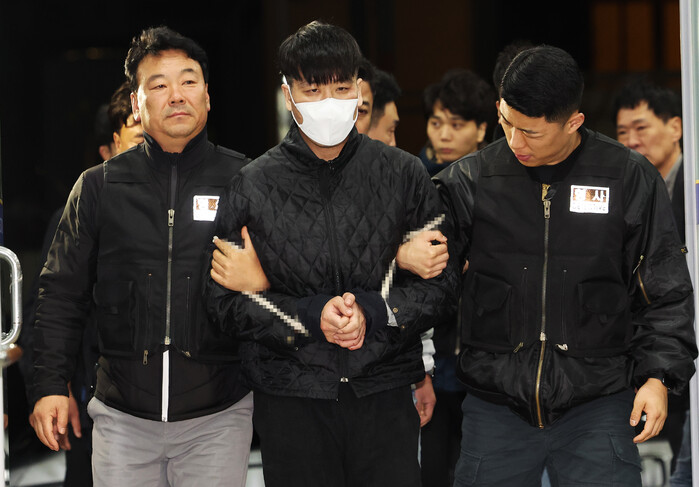 | ▲ 특수강도 혐의로 서울구치소에 수감됐다가 병원 치료 중 달아난 김길수가 지난 6일 오후 검거돼 경기도 안양동안경찰서로 압송되고 있다. (사진=연합뉴스 제공) |