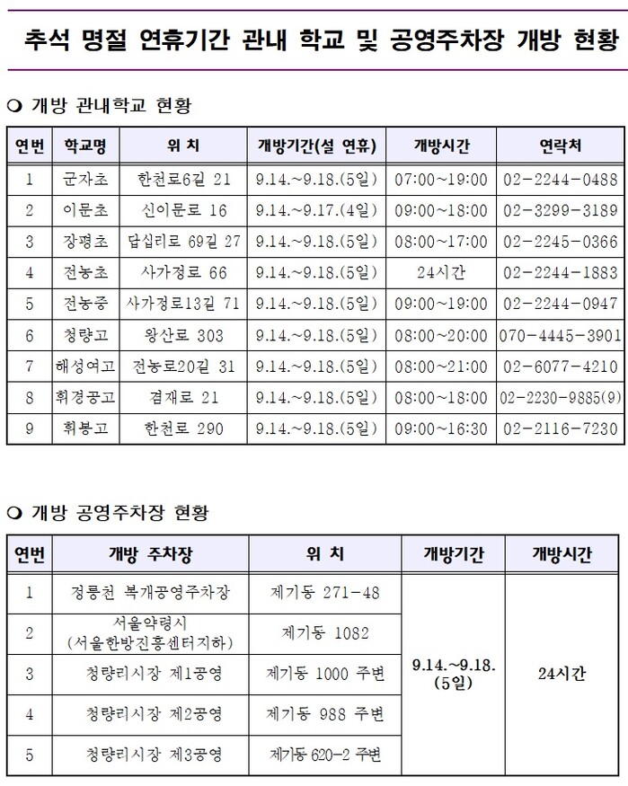 추석 연휴동안 무료 개방하는 학교 주차장은 군자초등학교를 포함한 초·중·고등학교 9곳으로, 공영주차장은 정릉천 복개공영주차장 등 5곳이다. 개방시간은 장소별로 상이하므로 반드시 확인 후 이용해야 한다.