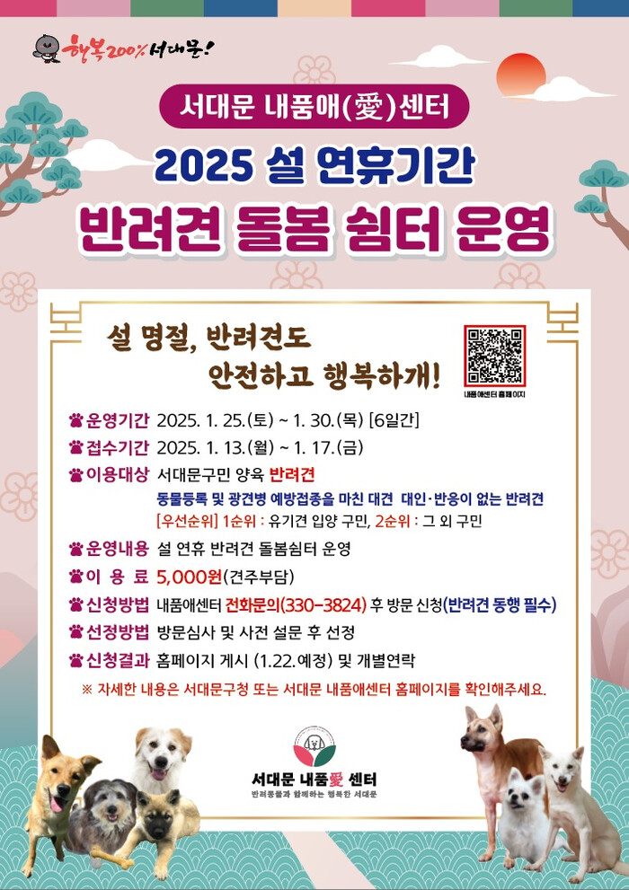 [시민일보 = 이대우 기자] 서울 서대문구(구청장 이성헌)가 주말과 설 연휴가 이어지는 이달 25~30일 ‘서대문 내품애(愛)센터’(모래내로 333)에서 ‘반려견 돌봄 쉼터’를 운영한다.