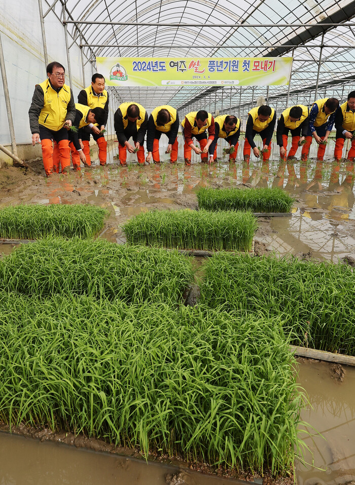 6일 오전 경기 여주시 우만동 비닐하우스 논에서 열린 행사에서 참석자들이 모를 심고 있다.