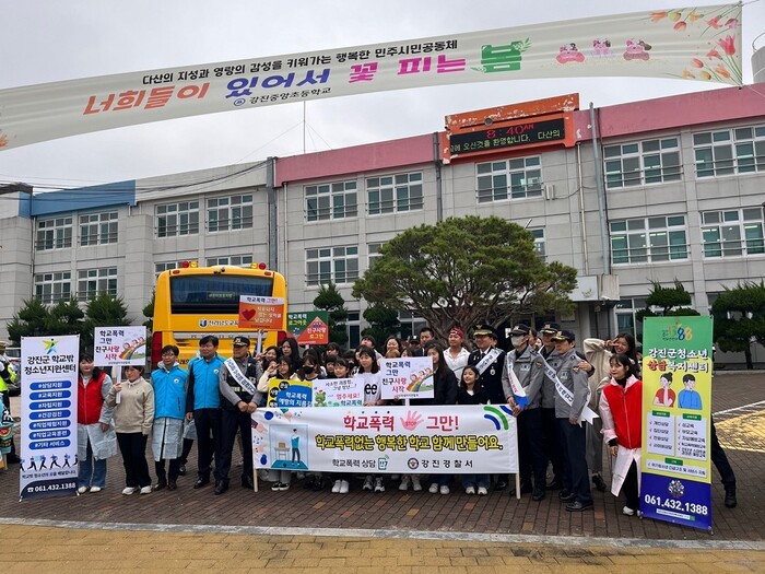 | ▲ 강진군, 지난 3월 22일 유관기관과 읍내 중앙초등학교 앞에서 학교폭력 근절 찾아가는 거리 상담 캠페인 / 강진군 제공 |