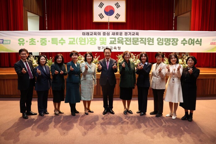 경기도교육청이 21일 오는 3월1일자 신규 임용 교(원)장, 장학(교육연구)관, 신규 장학(교육연구)사를 대상으로 임명장을 수여했다. 대상자는 신임 본청 국장 2명과 교육지원청교육장 5명, 직속기관장 4명, 본청 과장 5명, 신규 장학(교육연구)관 19명 등 총 321명이다. 사진은 수여식에서 임태희 교육감(가운데)과 수여자들이 기념촬영을 하고 있는 모습. (사진=경기도교육청 제공)
