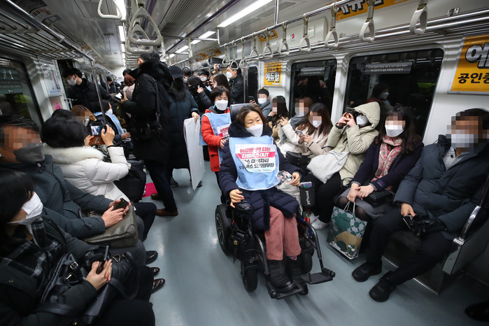 서울교통공사에 따르면 이날 오전 7시12분께부터 전국장애인차별철폐연대(이하 전장연)가 5호선 왕십리역에서 휠체어 바퀴를 전동차와 승강장 사이 틈에 끼워 문이 닫히지 못하게 막는 방식으로 시위를 시작했다.
