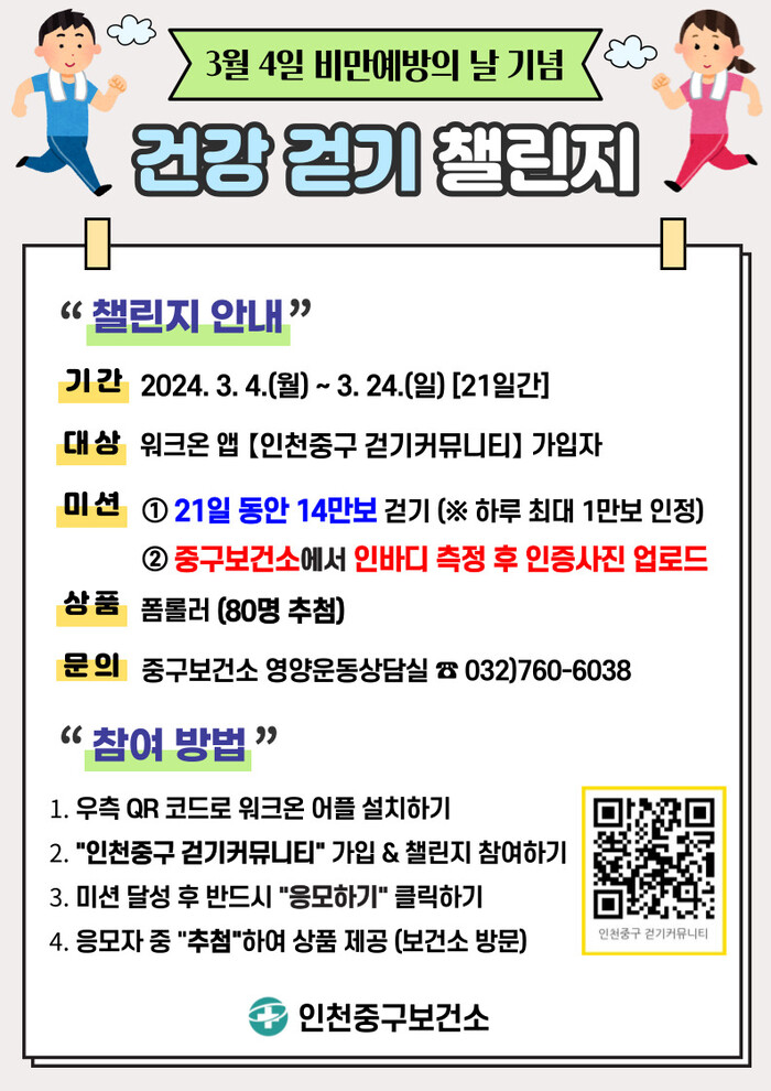 [인천=문찬식 기자] 인천 중구보건소가 비만 예방의 날(3월4일)을 맞이해 ‘건강 걷기 챌린지’를 진행한다고 4일 밝혔다.