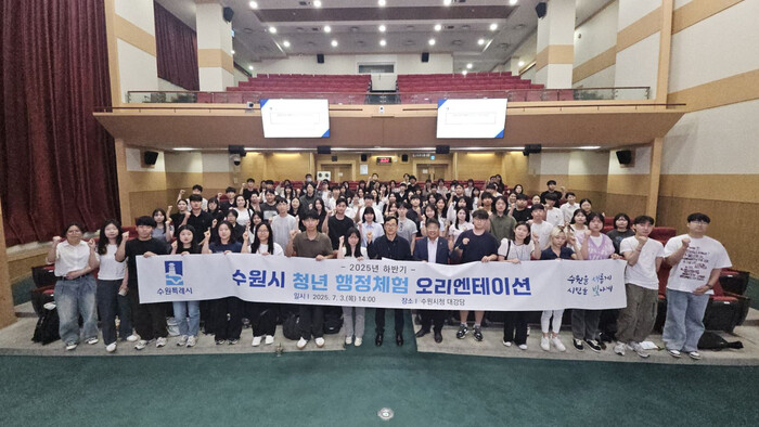 경기 수원시가 ‘2025년 하반기 수원시 청년행정체험’ 참여자 94명을 선발하고, 최근 시청 대강당에서 오리엔테이션을 했다. 이날 오리엔테이션은 수원시청소년청년재단의 청년정책 소개를 시작으로 근무 준수사항 안내, 개인정보보호 교육 등으로 진행됐다. 사진은 참여자들이 기념 촬영을 하는 모습. (사진=수원시청 제공)