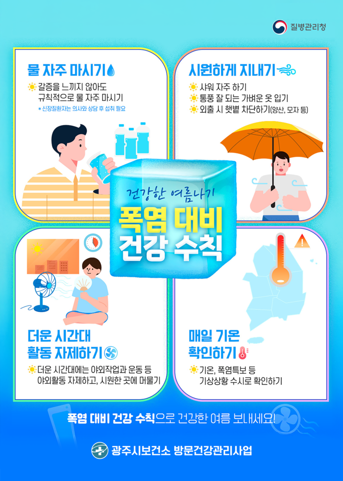 아울러 시는 폭염으로 인한 건강 피해는 기본적인 수칙만 잘 지켜도 충분히 예방 가능하며 ▲물 자주 마시기 ▲시원하게 지내기 ▲더운 시간대 활동 자제하기 ▲매일 기온 확인하기 등 건강 수칙 준수를 당부했다.