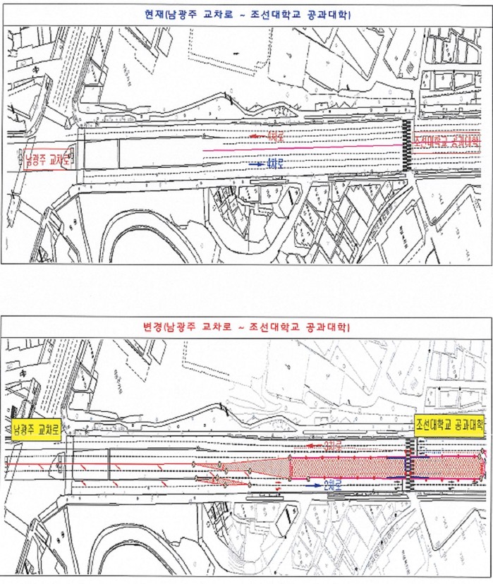 또 남광주 고가도로에서 조선대사거리 방면 차로는 4개 차로에서 2개 차로로 축소되고 다시 조선대학교 공과대학 앞 주변부터 4개 차로로 확대된다.