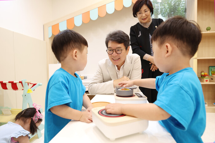 | ▲ 최근 정식 운영에 들어간 '성수 키즈카페'를 방문한 정원오 구청장이 아이들과 소통의 시간을 보내고 있다. (사진=성동구청 제공) |