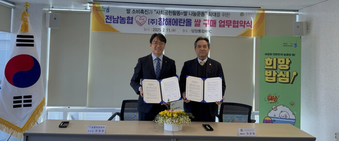 이날 체결식에는 농협전남본부 이광일 본부장, ㈜창해에탄올 이연희 대표이사, 수북농협 양남근 조합장(담양통합RPC 이사회 의장)을 비롯한 양측 주요 관계자들이 참석했다. 양 기관은 상호협력과 공동 발전 방안으로 ▲ 전남 쌀 구입으로 쌀 소비촉진 캠페인 동참 ▲ 복지 사각지대의 소외계층을 돕는 지역사회 공헌사업 추진 등 주요 협력 사항을 이행하기로 확약했다.