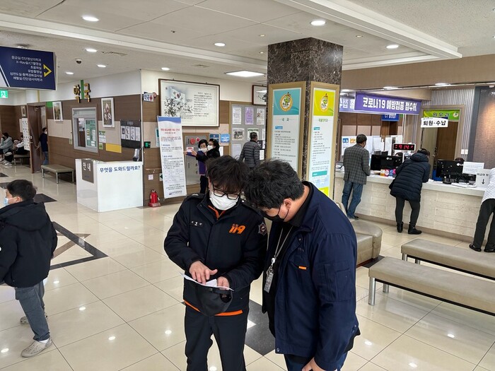 | ▲ 해남소방서 서영근 반장이 해남우리병원을 방문해 병원소방안전 관리 담당에게 화재 예방 안전 수칙을 전달하고 있다. / 해남소방서 제공 |