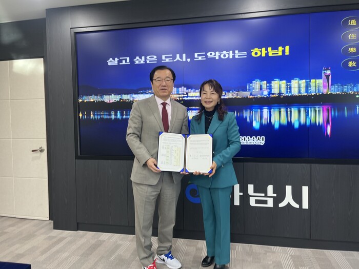 경기 하남시는 광주하남교육지원청과 2024년도 하남미래교육협력지구 운영을 위한 부속합의를 체결했다. 두 기관은 캠퍼스투어 및 기업탐방 등 20개 사업을 추진할 계획이며, 하남시에서 38억2000만원, 교육지원청에서 23억8000만원 등 총 62억원의 사업비가 지역 미래인재 양성을 위해 투입된다. 사진은 협약식에서 이현재 시장(왼쪽)이 김성미 교육장과 함께 기념사진을 촬영하고 있는 모습. (사진=하남시청 제공)