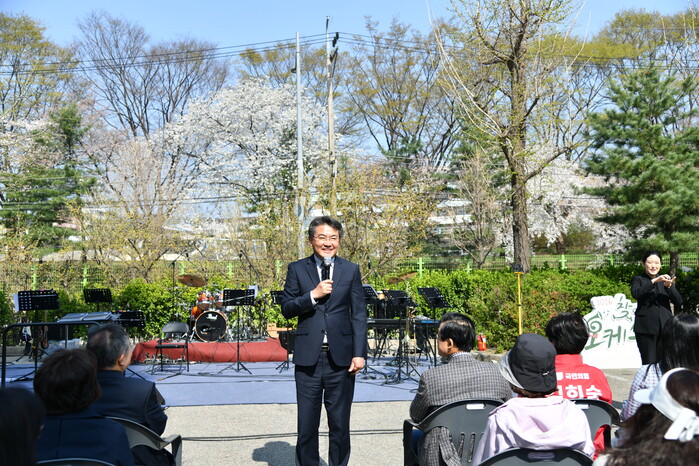 오승록 서울 노원구청장이 최근 하계동 청솔아파트 707동 옆 주차장에서 열린 ‘찾아가는 오케스트라‘에 참석했다. 사진은 공연장에서 오 구청장이 인사말을 하는 모습. (사진=노원구청 제공)
