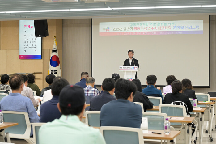 서울 중구가 공동주택을 투명하고 효율적으로 관리할 수 있도록 돕기 위해 입주자대표회의 구성원들을 대상으로 28일 구청에서 교육을 실시했다. 이번 교육은 '공동주택관리법'에 따라 입주자대표회의 구성원이 매년 4시간 받아야 하는 법정의무사항이다. 사진은 교육에 참석한 김길성 구청장이 인사말을 하고 있는 모습. (사진=중구청 제공)