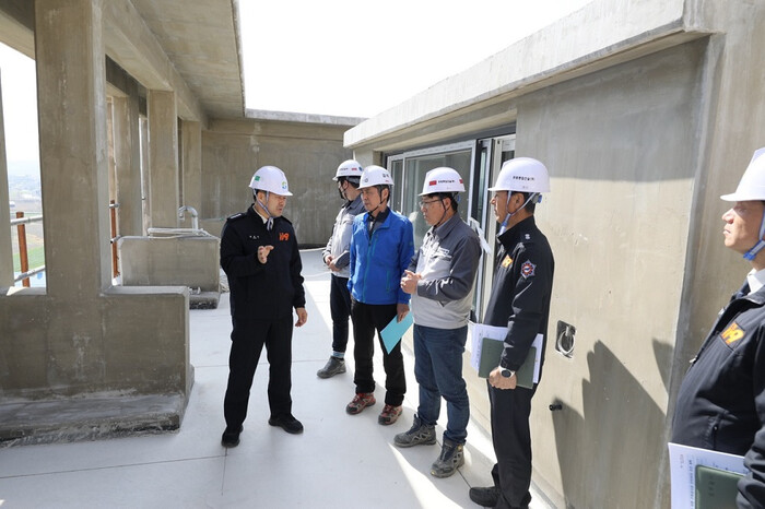 | ▲ 정용인 강진소방서장(왼 쪽)이 8일 강진군 승원팰리체 신축공사 현장을 방문해 현장관계자 등과 화재안전 강화를 위한 현장지도를 하고 있다. / 강진소방서 제공 |