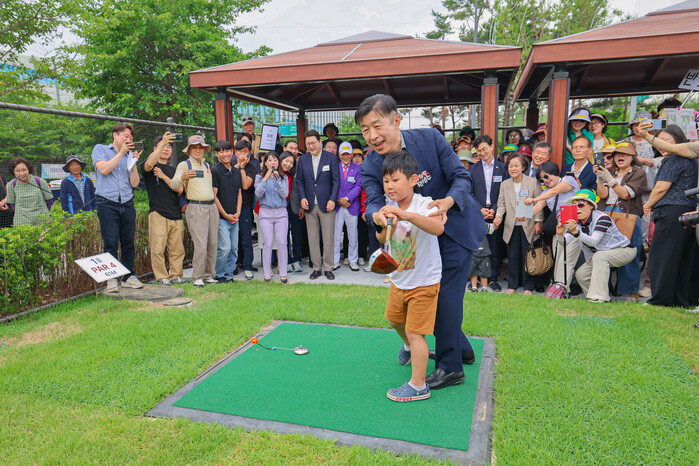 서울 서초구가 24일 3代가 함께 소통하고 즐기는 ‘청계산 수변공원 파크골프장’ 준공식을 개최했다. 사진은 전성수 구청장이 파크골프장에서 어린와 함께 파크골프를 즐기는 모습. (사진=서초구청 제공)