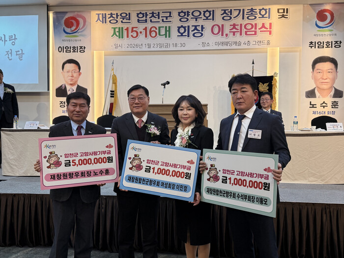 이날 행사에서는 제16대 노수훈 신임 회장이 고향사랑기부금 500만 원을 기탁했으며, 재창원합천군향우회 이민정 여성회장과 이황모 수석부회장도 각각 100만 원씩을 기탁해 고향 발전에 힘을 보탰다.