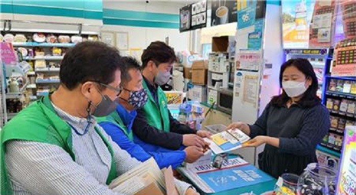 | ▲ 영암군 청소년 유해환경감시단, 지역주민과 업소에 청소년 출입 금지 및 술·담배 판매금지 스티커와 청소년 유해환경 OUT 리플릿을 배부 / 사진=영암군 제공 |