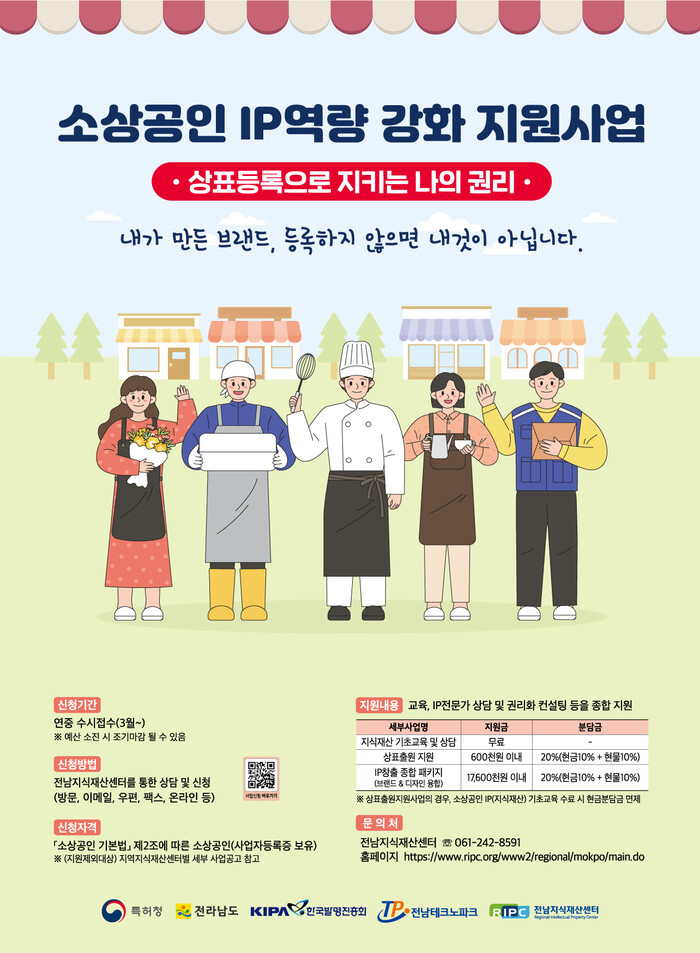 세부 사업별로 ‘소상공인 IP 출원(상표) 지원사업’은 22개 시ㆍ군 소상공인이 보유한 상호, 레시피 등의 아이디어를 상표, 특허, 디자인 등의 지식재산으로 권리화하도록 지원하는 사업이다.