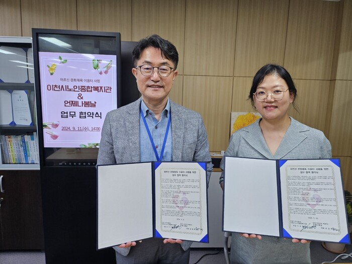 [시민일보 = 민장홍 기자] 경기 이천시가 11일 이천시노인종합복지관이 2024년 어르신 문화 체육 이음터 사업 ‘마음 지킴 이웃터-원예 교실’ 사업 수행을 위한 지역 문화시설과의 업무 협약을 체결했다고 전했다.