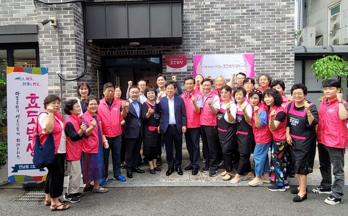 | ▲ 최근 문을 연 효도밥상 연남동 1호점에서 박강수 구청장(가운데)이 봉사자들과 함께 기념촬영을 하는 모습. (사진=마포구청 제공) |