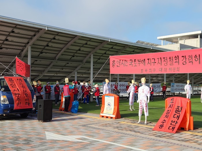 이들은 특히 "이상일 용인시장이 LH및 국토부의 지구 지정을 반대한다며 선거 공약으로 내세웠으면서도 아무런 조치를 취하지 않고 있다"며 "공약을 못 지키는 시장은 물러가라"는 등의 현수막을 걸고 농기계를 앞세우며 꽹과리를 치며 시위를 펼쳤다.