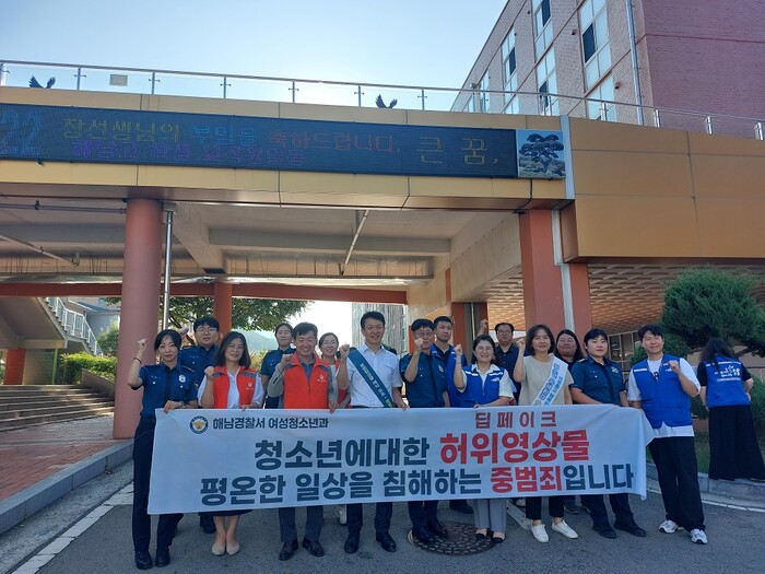 [해남=정찬남 기자] 전남 해남경찰서는 지난 10일 아침 해남군 해남고등학교 앞에서 ‘청소년 딥페이크 범죄 예방활동 등굣길 캠페인’을 펼쳤다.