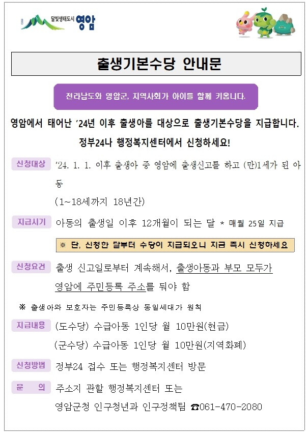 전남도와 영암군의 출생기본수당은 소득 수준과 관계없이 2024년 이후 출생해 전남에 출생신고를 하고 군에 주소를 둔 1세 아동에게 지급된다.