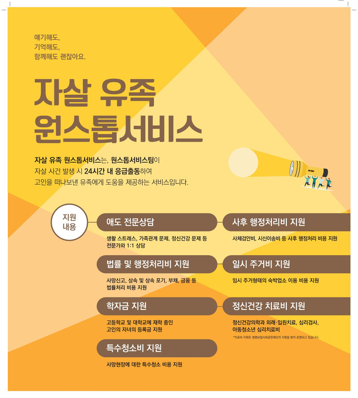 ‘자살유족 원스톱 서비스 지원사업’은 자살 유족이 갑작스러운 상실과 충격에서 벗어나 신속히 일상으로 복귀할 수 있도록 심리적 지원부터 특수청소비, 일시주거비, 학자금 등 경제적 지원까지 통합적으로 유족의 상황에 맞는 맞춤형 서비스를 제공한다.