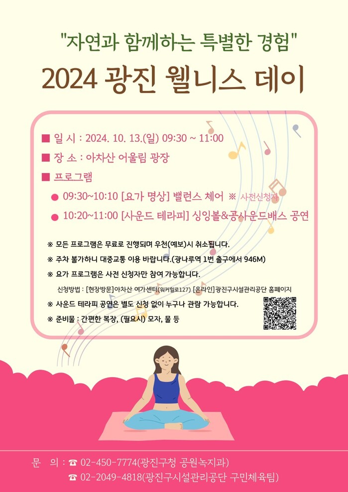 광진 웰니스 데이(Gwangjin Wellness Day)는 아차산 여가 센터에서 운영하는 요가 프로그램을 야외에서 진행해, 바쁜 일상에 지친 구민에게 색다른 여가 체험 기회를 제공하기 위해 마련됐다.