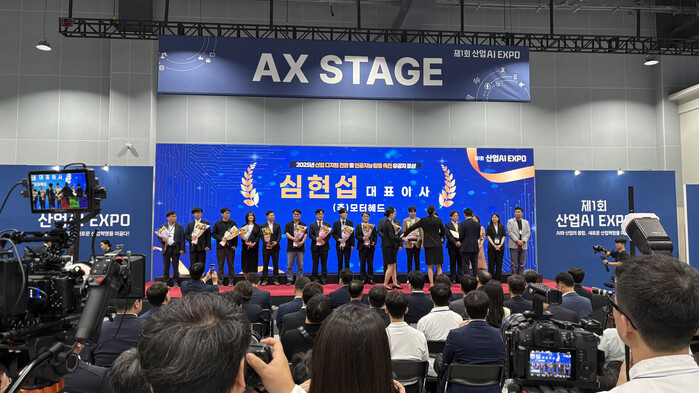 | ▲ (사진) 제1회 산업AI 엑스포에서 (주)모터헤드 심현섭 대표이사가 산업통상자원부 장관 표창을 수상하고 있다. |