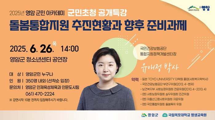 공개특강으로 진행되는 이날 아카데미는, 올해 전국 군 단위 최초로 통합돌봄추진단을 신설해 체계적 서비스를 추진하고 있는 영암군의 돌봄 정책을 알리고 공감대를 형성하는 자리가 될 것으로 기대된다.