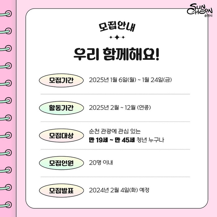 참여대상은 순천에 생활 공간이 있는 만 19~45세 청년으로, 순천을 사랑하고 관광 콘텐츠 활성화에 관심 있는 시민 누구나 참여할 수 있다.