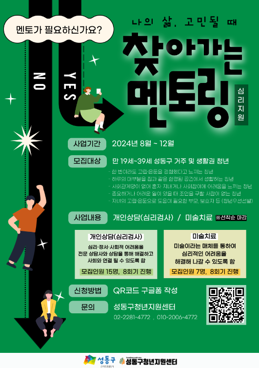 이번 사업은 12월까지 운영되며, 선착순으로 참여 신청을 받는다. 참여를 희망하는 경우, 성동구청년지원센터에 전화하거나 홍보물에 게시된 큐알(QR) 코드를 통해 신청하면 된다.