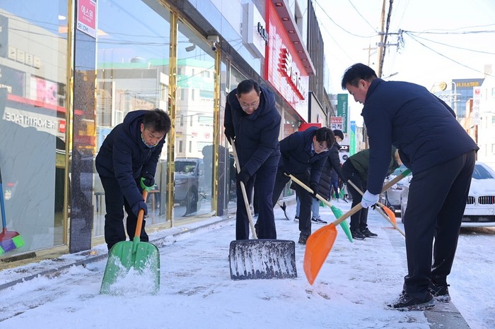 명현관 군수는 이날 새벽 영하 13도까지 내려가는 최강 한파 속에 내린 눈이 빙판길로 다져질 것을 우려해 1천여 명의 전 공직자들과 함께 읍면 시가지와 응달진 인도를 중심으로 통행량이 많은 골목구간까지 구석구석 제설작업을 함께 했다.