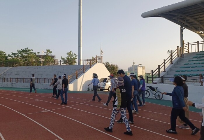 | ▲ 강진군민들이 워크온 챌린지 달성을 위해 강진종합운동장 트랙을 걷고 있다. / 강진군 제공 |