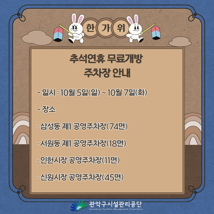 이번에 무료 개방하는 주차장은 총 4곳 148면으로, 추석 연휴가 시작되는 10월 5일부터 7일까지 ▲삼성동제1공영(74면) ▲서원동제1공영(18면) ▲인헌시장공영(11면) ▲신원시장공영(45면)을 무료로 개방한다.