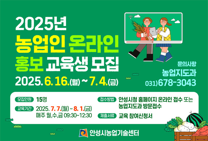 [안성=오왕석 기자] 안성시농업기술센터(소장 이상인)는 6월 16일부터 7월 4일까지 ‘2025년 농업인 온라인 홍보 교육’의 교육생을 모집한다고 밝혔다.